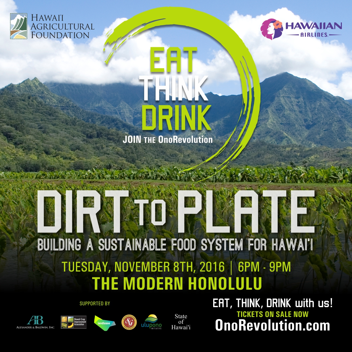EAT THINK DRINK is presented by Central Pacific Bank with support from Alexander & Baldwin, Armstrong Produce/FreshPoint Hawaii, Bayer, Centinel/Island Palm Communities, Hawaii Longline Association, Matson, Prince Waikiki, State of Hawai‘i, Ulupono Initiative, United Airlines, and United Fishing Agency Ltd.