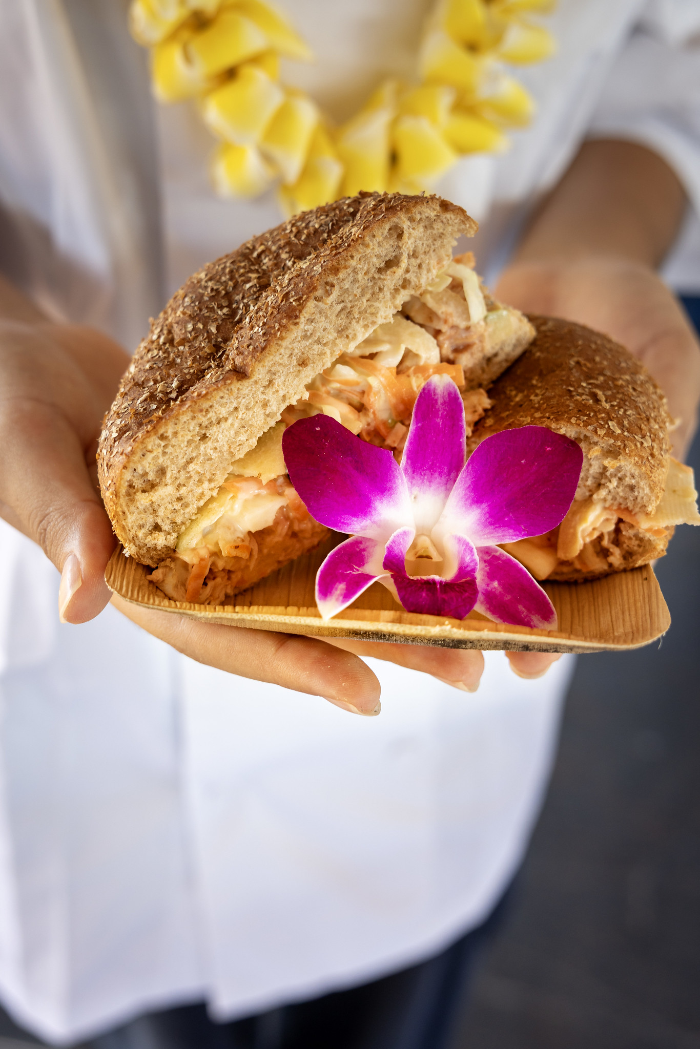 Guava BBQ Pulled Chicken Sandwich with Whole Grain Bun and Lilikoi Coleslaw
